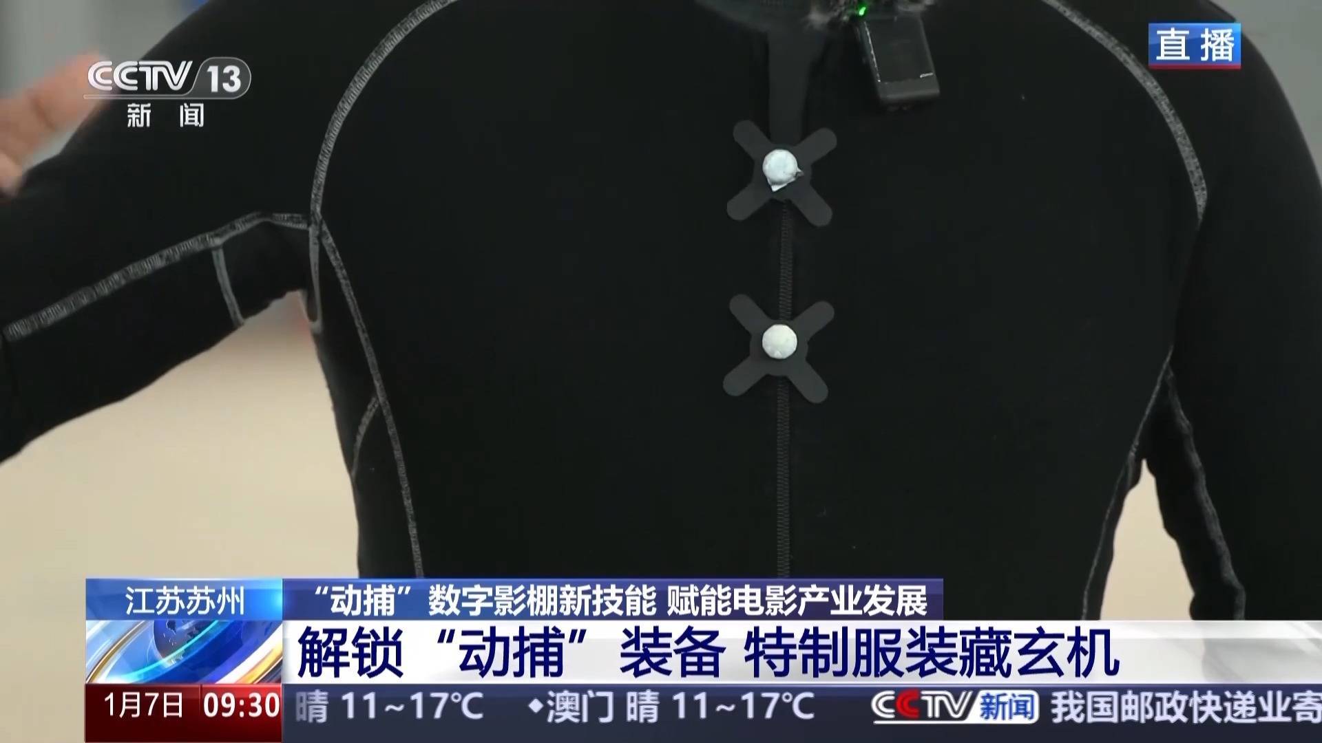 rr总台记者 徐大为:大家看我身上的这套装备,它就是动捕服,有点紧身,当然,不是为了秀身材哈,而是在动画制作过程中的很重要的一环,动作捕捉,简称动捕。大家看这套黑色的衣服,摸上去质感很特别,表面是毛毡材质,里面很光滑,而且必须贴身穿才够紧身,这样才能保证动作捕捉的精准度。