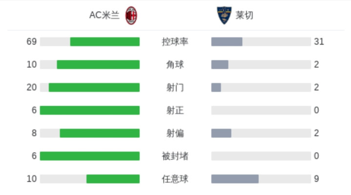 而全场比赛的数据也能佐证这一点,AC米兰在各项数据上都占据着压倒性的优势。不仅控球率高居7成,射门比更是达到了10倍。也正是这一项项占优的数据,让最终的胜利水到渠成。