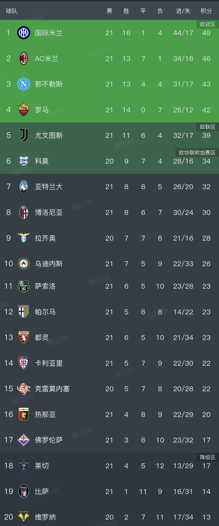 随着这些比赛的结束,意甲联赛积分榜也再度产生新的变化。